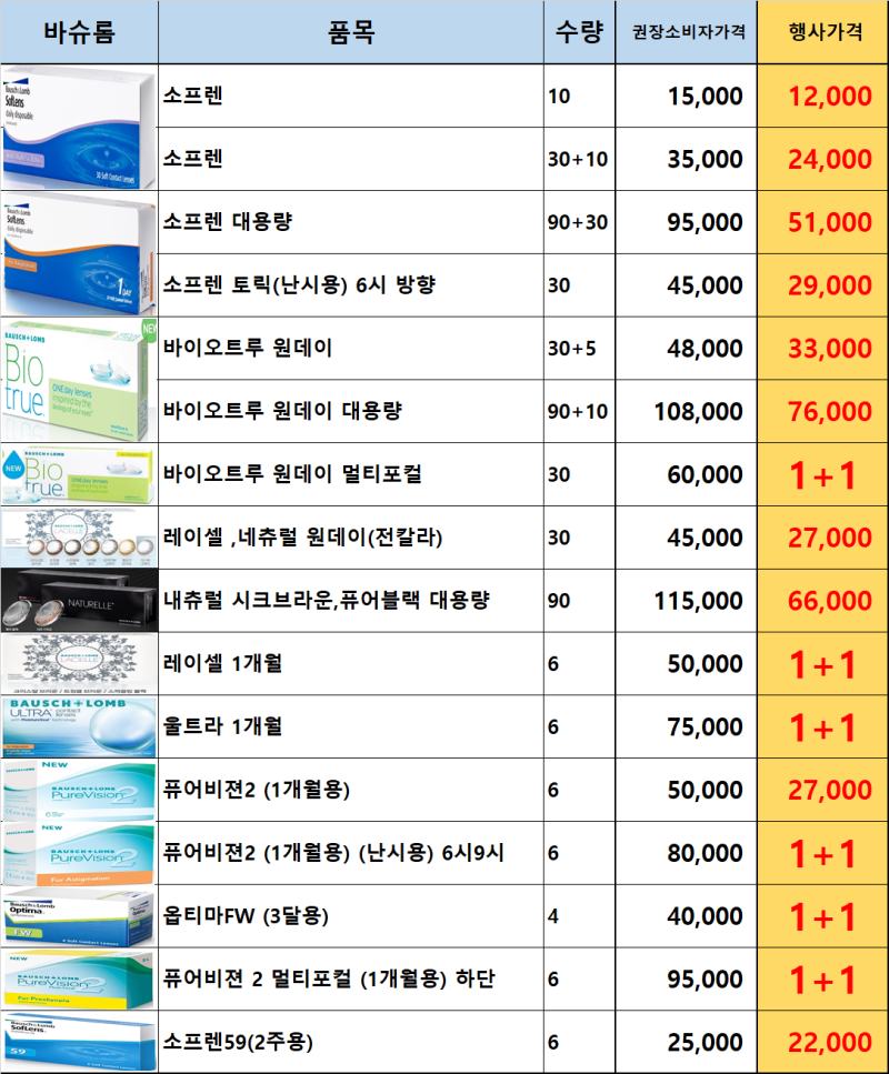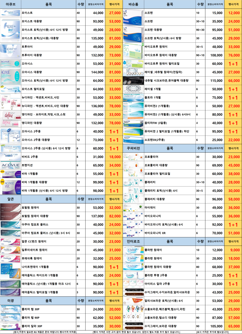 알콘/아큐뷰/쿠퍼비전/미광/클라렌/바슈롬까지 모든 상품이 할인되어 저렴하게 구매하실 수 있습니다. ^^